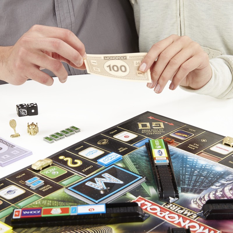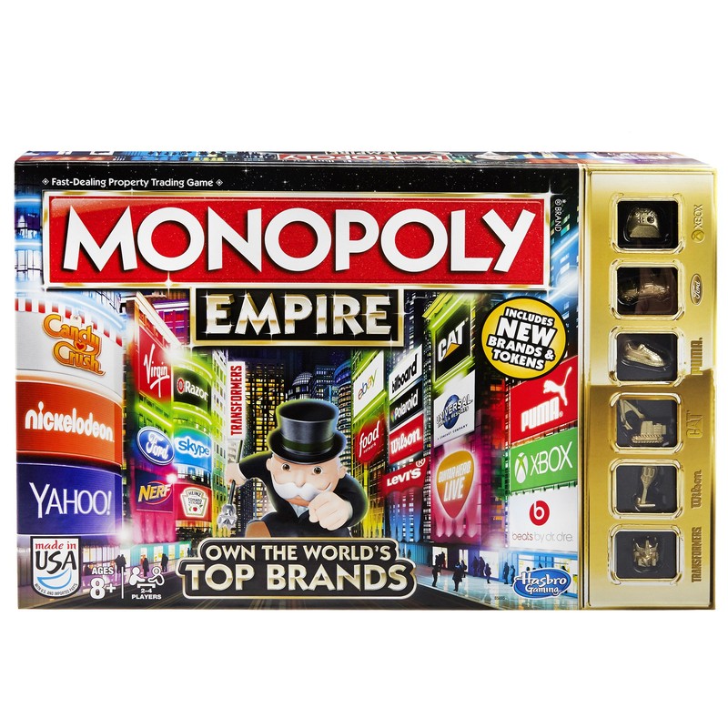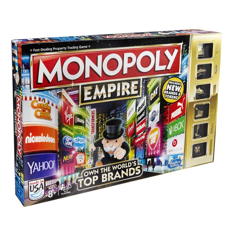 In the Monopoly Empire game, players can own the world's top brands. After choosing one of the uniquely branded tokens, players move around the board, and start building their empires. The game is a race to the top as players buy their favorite brands one by one and fill their towers. Players can own famous brands, including Nerf, Transformers, Levi's, and more. Opponents collect rent from their rivals; the higher their tower, the more they can charge! For two to four players, the first player to fill their tower with billboards wins! The Hasbro Gaming, Transformers, Nerf, and Monopoly names and logos, the distinctive design of the gameboard, the four corner squares, the Mr. Monopoly name and character, as well as each of the distinctive elements of the board and playing pieces are trademarks of Hasbro for its property trading game and game equipment.