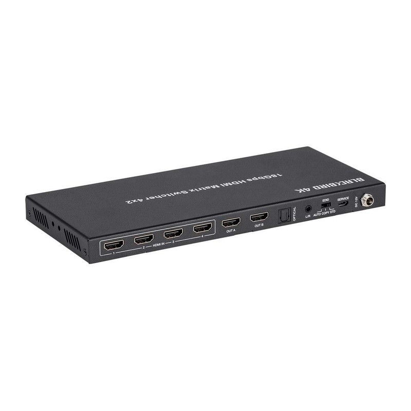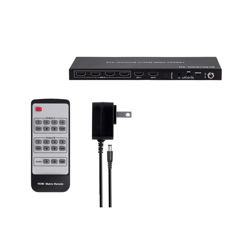 Monoprice Blackbird 4K HDMI Matrix 4x2 HDR 18G 4K@60Hz YCbCr 4:4:4 EDID Coaxial Audio Powered Switch Control Remote (139667)