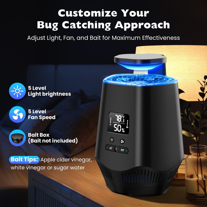 - Smart and Customizable: Equipped with a smart chip and light sensor, our mosquito trap offers auto night mode, 24/7 manual mode, and 5 adjustable brightness and fan speed settings for tailored protection