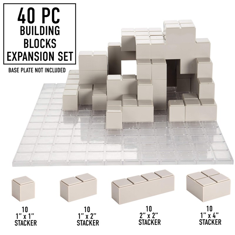 - Pieces include 10 - 1”x1” stacker, 10 - 1”x2” stacker, 10 - 1”x4” stacker, and 10 - 2”x2” stacker