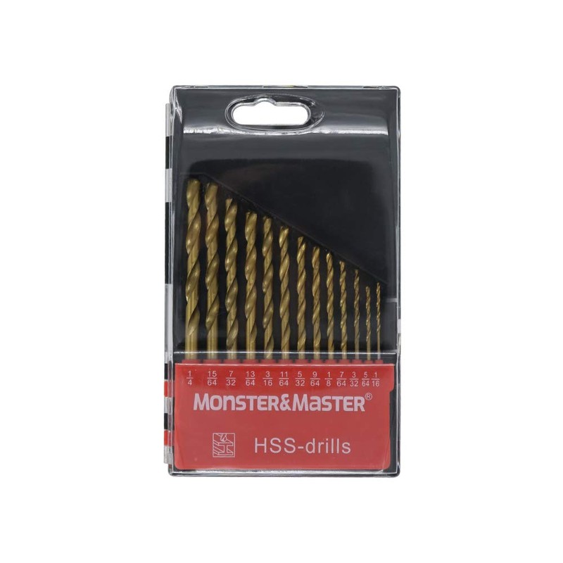 Monster & Master Titanium Plated Drill Bit Set, 13-Piece, High-Speed Steel Gold Drill Bits with 135 Degree Split Point Tip, 1/16" to 1/4", MM-TP-001