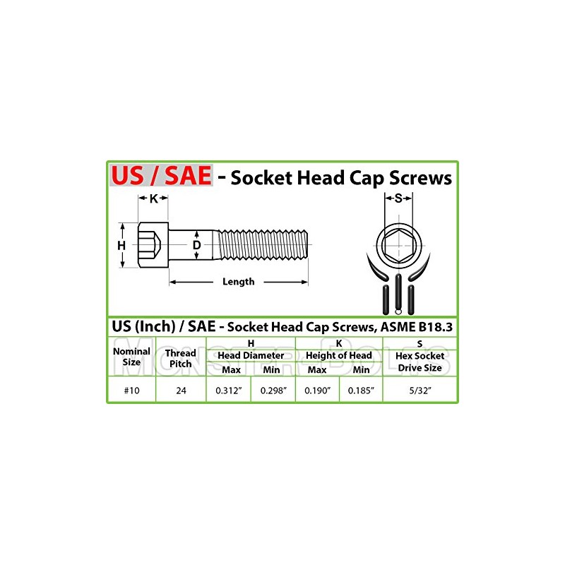 - Monster Specifications: - Diameter: #10 (0.188") - Thread Pitch: 24 TPI - UNC / Coarse Thread - System of Measurement: Inch (US) / SAE - Material: Stainless Steel 18-8 / A2 - Specifications: ANSI/ASME B18.3, ASTM A574