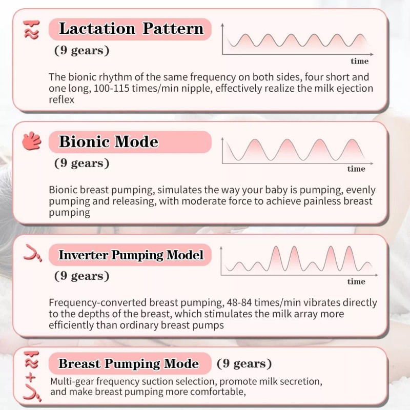 Modo de nivel ajustable: Hay modo de estimulación de la secreción de leche, modo de ordeño, modo de conversión de frecuencia y modo biónico, y hay diferentes grados de tensión según sus necesidades.