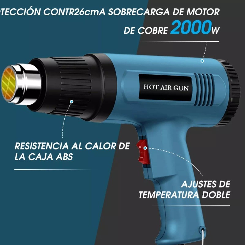 DECAPADOR DE AIRE CALIENTE: Excelente herramienta eléctrica que expulsa aire caliente para eliminar pinturas y barnices, secar la humedad de las maderas o para curvar o suavizar plástico. Funciona mediante conexión de cable con una potencia de salida de hasta 2000 W.