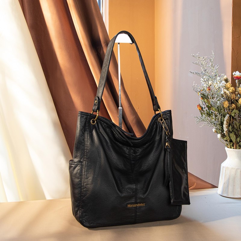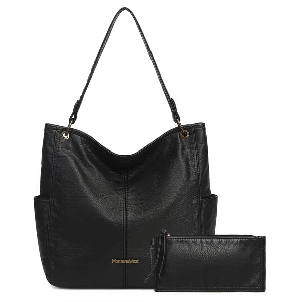 Montana West Hobo Purse for Women 2pcs Handbag Set Shoulder Bag Soft Washed Leather Top Handle Satchel with Wallet MWC2-115BK