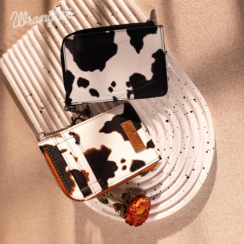 - Southwestern cow print womens small card wallet with Wrangler logo W design.