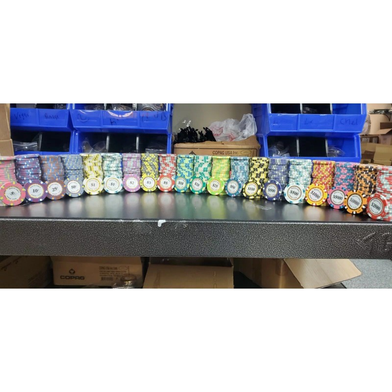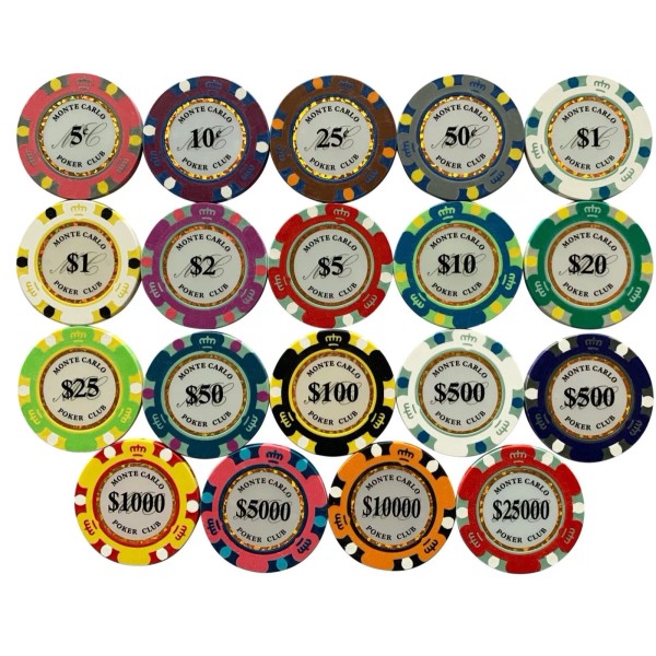Brand New Monte Carlo 14 Gram Heavy Clay Poker Chips with Denominations. Monte Carlo chips are perfect for traditional players with its classy and elegant design. The easy to read denominations make it a perfect chip for all poker players. This is the NEW Monte Carlo Smooth 14 Gram Poker Chips, They are smooth on the edges and easier to shuffle! This is a sample pack , you will get 1 chip of each denomination shown - total 20 chips mega sample pack! from 5 Cents to $25,000 and NEW $3 Just Released! |