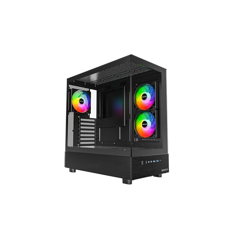 MONTECH XR, ATX Mid-Tower PC Gaming Case, 3 x 120mm ARGB PWM Fans Pre-Installed, Full-View Dual Tempered Glass Panel, Wood-Grain Design I/O Interface, Support 4090 GPUs, 360mm Radiator Support, Black