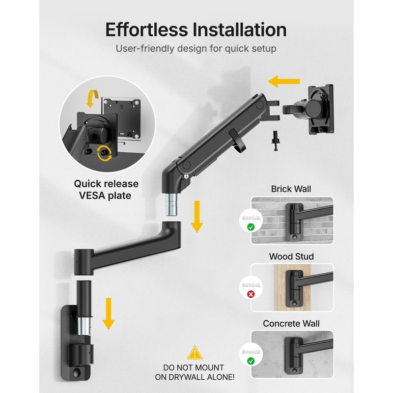 - 【Easy Installation】Designed for wood studs, brick, and concrete walls (Note: Please do not mount to drywall alone). The quick-release VESA plate makes installation effortless, allowing you to set up this monitor wall mount within 10 minutes. Ideal for use in office, home, studio and gaming setup, which is a multifunctional tool to enhance your efficiency and productivity