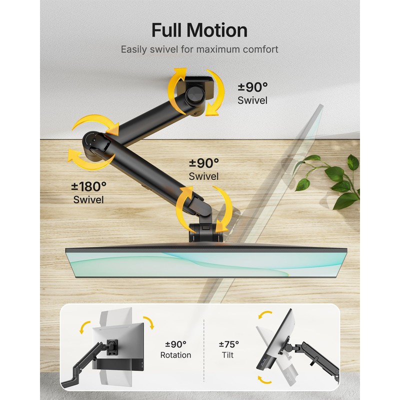 - 【Upgraded Construction】The single monitor arm is constructed from high-quality steel and aluminum for durability. It supports monitors weighing from 4.4 to 44 lbs, effectively reducing wobbling during use and keep the screen stable. The upgraded spring arm with 360°rotation makes adjustment easier and smoother, giving you greater flexibility to position your monitor exactly as you need