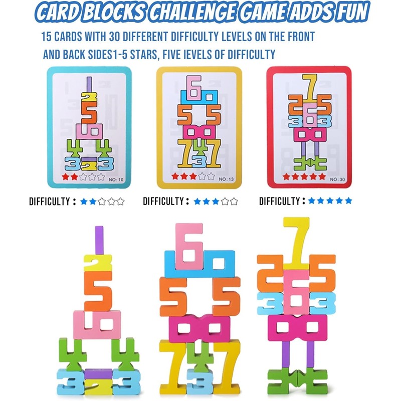 Bright colors: carefully designed shape, with bright colors, make building easier, help children to improve self-confidence and aesthetics, exercise the child's color cognitive ability, the bottom of each digital contains the corresponding points, help the baby more clearly understand the digital s and points of the corresponding relationship between the 15 cards included, front and back of a total of 30 different levels of difficulty decent, 1-5 stars, five levels of difficulty to choose from!