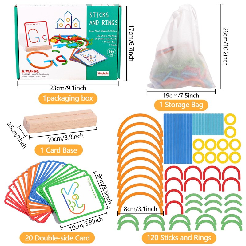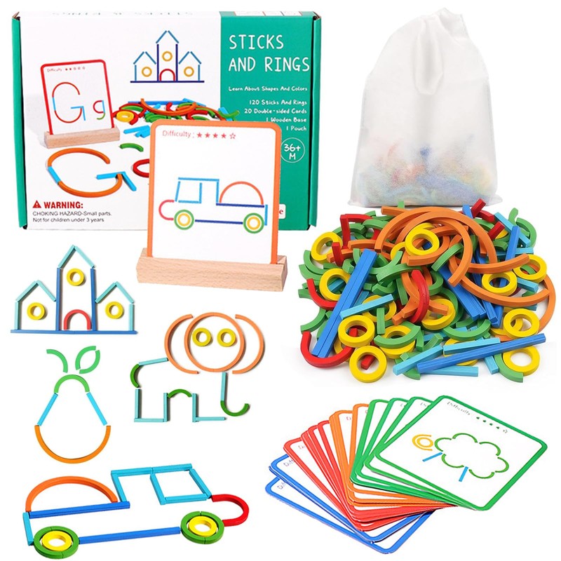 - Montessori toys from 3 years: Contains 120 wooden sticks and rings in different shapes and colours, 20 double-sided cards, a base and a storage bag - everything your child needs for hours of creative and educational activities.