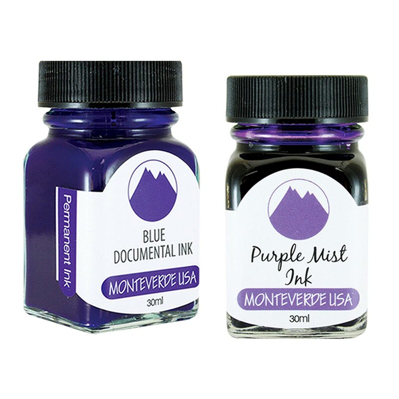 - Pack Contains the following Monteverde USA Ink Bottles: (1) Monteverde 30ml Blue Documental Ink Bottle (Permanent Ink). (1) Monteverde 30ml Purple Mist Ink Bottle.