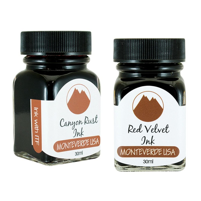- Pack Contains the following Monteverde USA Ink Bottles: (1) Monteverde 30ml Canyon Rust Ink Bottle. (1) Monteverde 30ml Red Velvet Ink Bottle.