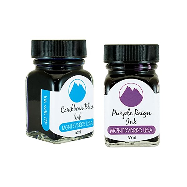 - Pack Contains the following Monteverde USA Ink Bottles: (1) Monteverde 30ml Caribbean Blue Ink Bottle. (1) Monteverde 30ml Purple Reign Ink Bottle.