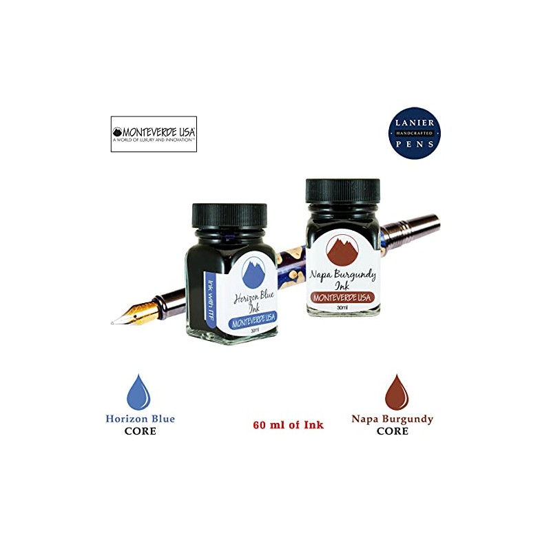 - Pack Contains the following Monteverde USA Ink Bottles: (1) Monteverde 30ml Horizon Blue Ink Bottle. (1) Monteverde 30ml Napa Burgundy Ink Bottle.