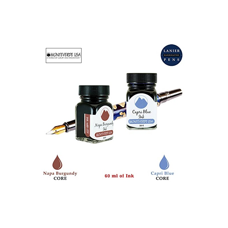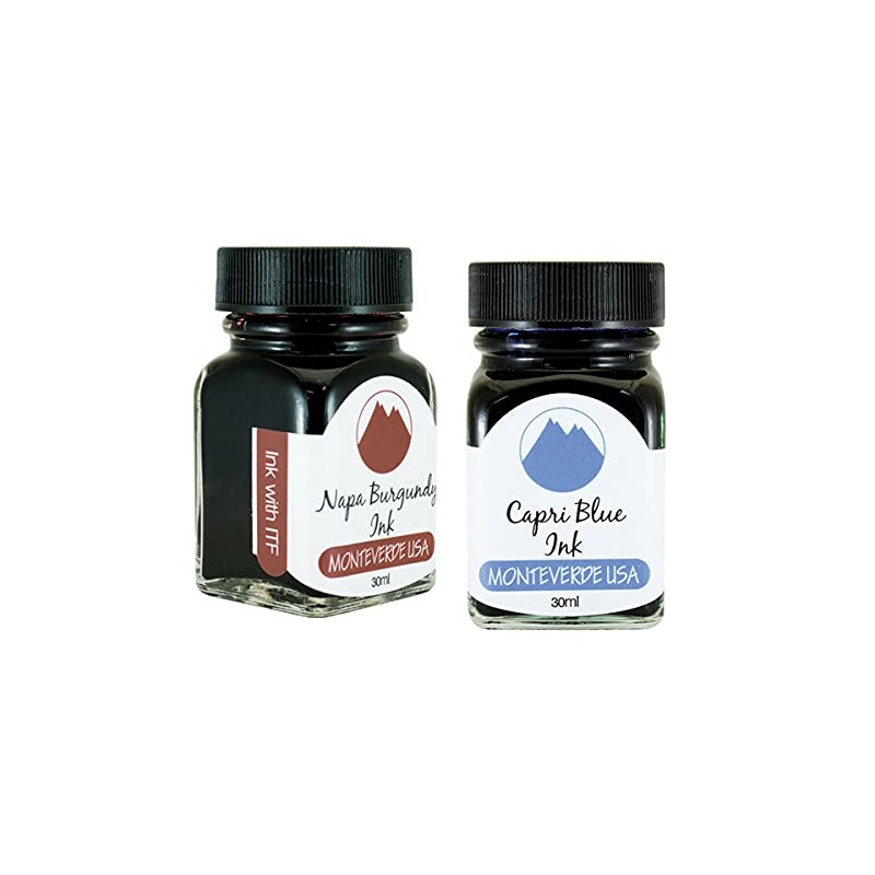 - Pack Contains the following Monteverde USA Ink Bottles: (1) Monteverde 30ml Napa Burgundy Ink Bottle. (1) Monteverde 30ml Capri Blue Ink Bottle.