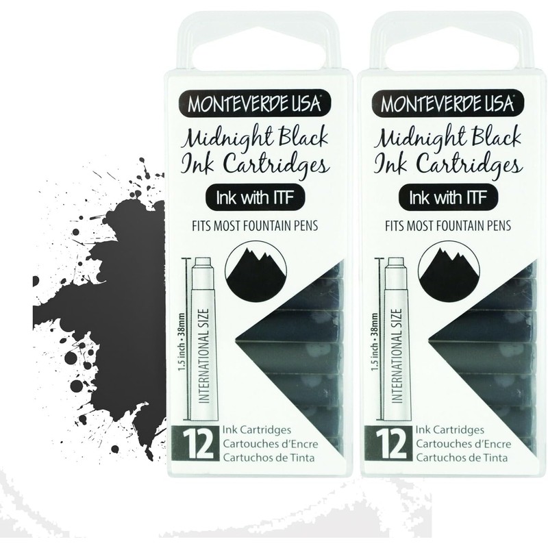 - Color: Midnight Black. Material: Plastic. Rich, vibrant fountain pen ink color. Collection: International Ink Cartridges Standard Size. Improved ink-flow quality and extends cap-off time. International standard size to fit most fountain pens. Slim, hangable, and reusable clean plastic storage box. The worlds latest leading European ink treatment formula (itf). Lubricates and protects ink feeding systems from corrosion and clogging. Total ink cartridges 24 pieces (12 pack each box).