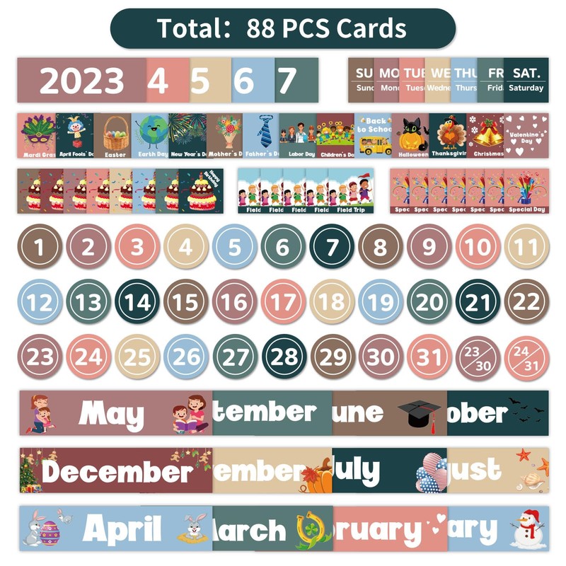 - đăAMAZING DESIGNă- Great Selection Of Cards including day, month & year cards, seasonal & weather cards, as well as special & customizable cards - a colorful add-on for the PVC pockets. 10 blanks to personalize! 12 months of the year, calendar days:1-32, holidays:19, Birthday: 8special day