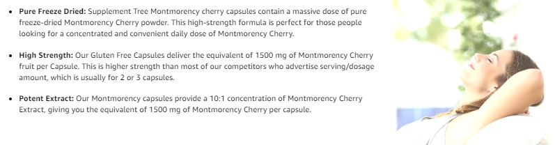 HIGH STRENGTH FORMULA – Supplement Tree Montmorency Cherry Capsules deliver 1500mg of pure freeze-dried Montmorency cherry powder per capsule (3000mg per daily serving). This concentrated, high-strength formula provides a convenient daily dose for optimal results.