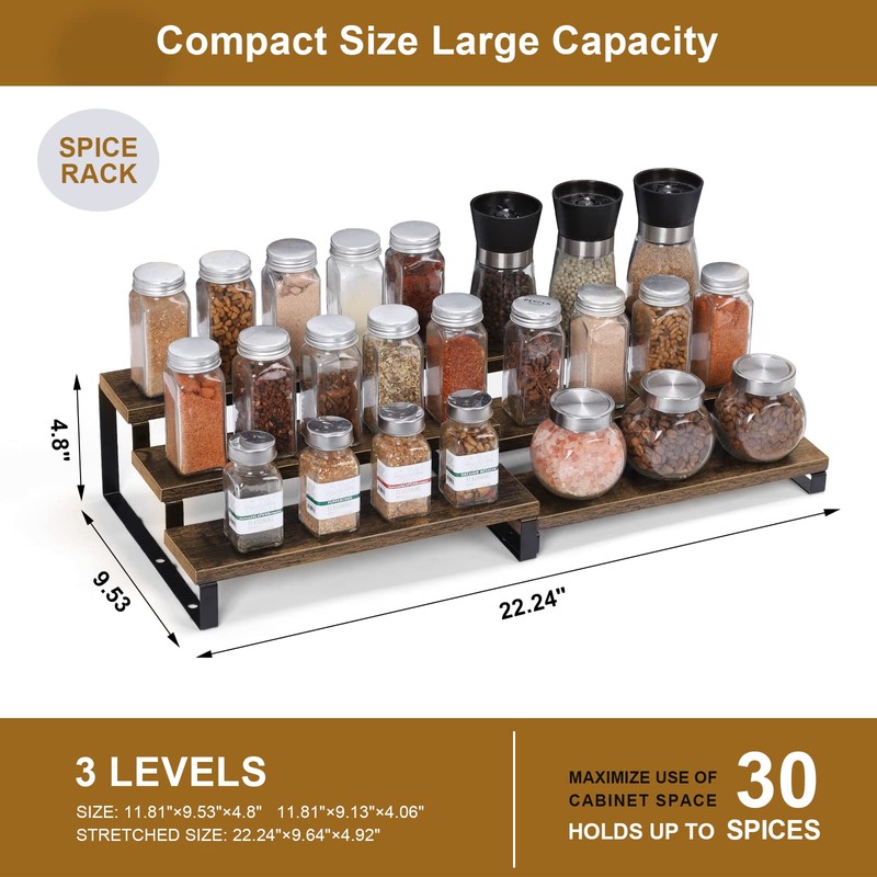 - ADJUSTABLE CABINET ORGANIZER: Expand the wooden spice rack to the size that fits your space and needs, size 12.2”~22.24”W * 9.53”D * 4.8”H. You can also separate as 4 set spice racks for different places.
