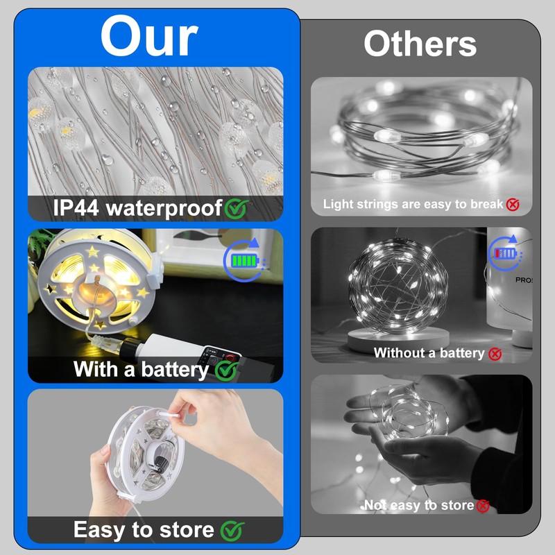 • 【Multifunctional Camping Light】The ultimate camping companion - our indoor/outdoor String Lights. These multifunctional camping lights are not just for illuminating your campsite. They double up as emergency lights. With a length of 33FT 100 LED, these lights transform into ambiance strings perfect for sprucing up your home, tent, or adding flair to birthday and holiday decorations. Hang them over your tent for a cozy glow or drape them around for a touch of romance.