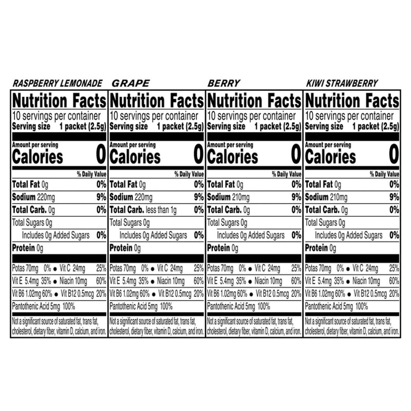 - Convenient Hydration: Easy-to-use powder mix with 40 single-serve packets. Zero Sugar, Great Flavors: Includes Raspberry Lemonade, Grape, Berry, and Kiwi Strawberry. Replenishes Electrolytes: Supports hydration and recovery after exercise. Customizable Taste: Mix with 16.9-oz or 20-oz water bottles for your preferred flavor intensity. Quality and Sustainability: Made with care by a trusted brand committed to a better future.