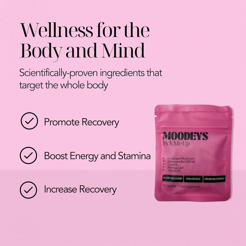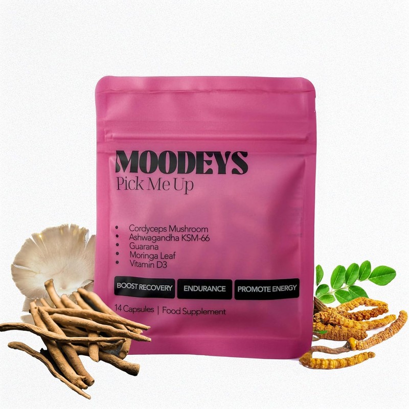 Moodeys Pick Me Up, Endurance Boosting Supplement | Aids Aerobic Activity & Supports Recovery | 100% Organic, Natural Functional Mushrooms | Cordyceps Mushroom (5,250mg) & Ashwagandha KSM-66 (3,600mg)