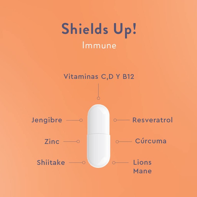 Moods | Shields Up! | Immune - Multivitaminico para protegerte y elevar tu energía mental - Vitaminas C, D, B12, Jengibre, Cúrcuma, Zinc, Resveratrol, Piperina, Lions Mane y Shiitake - 100% Natural y Vegano - 60 Cápsulas para 30 días