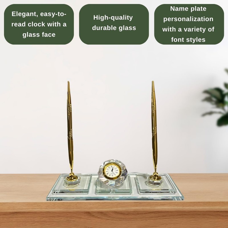 MOOGCO Custom Desk Name Plate: Black Glass Desk Name Plate with Clock, Pen Holder with 2 Pens, Cardholder - Desktop Nameplate, Desk Organizer (Black Glass Clock&Card)
