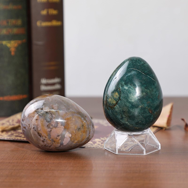 - Natural Ocean Jasper Crystal Egg with Stand: Crystal egg is well cut and finely polished out of natural Ocean Jasper crystal, featuring unique textures(some may contain geodes and small cracks). It is rare and full of Ornamental value, suitable for desk decor, crystal collecting, small Aquarium decor, Easter decor, Easter gift, Reiki crystal egg gift, etc.