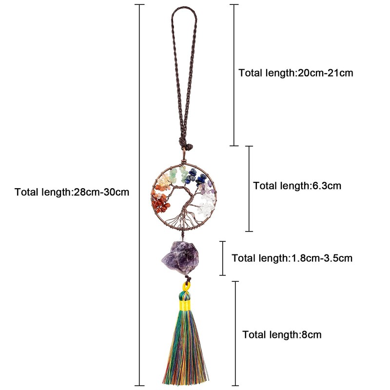Size(approx): Total length 11-11.8inch/28-30cm. Nylon rope diameter 7.8-8.2inch/20-2cm. Tree of Life length 2.4inch/63mm, width 1.9inch/50mm. Raw Stone length 0.7-1.4inch/18-35mm, width 0.7-1.1inch/18-30mm, thickness 0.4-0.9inch/12-25mm. Tassels length 3.1inch/8cm. Weight about 20-40gram/pc.