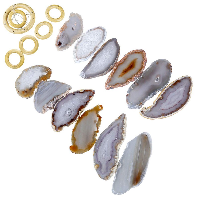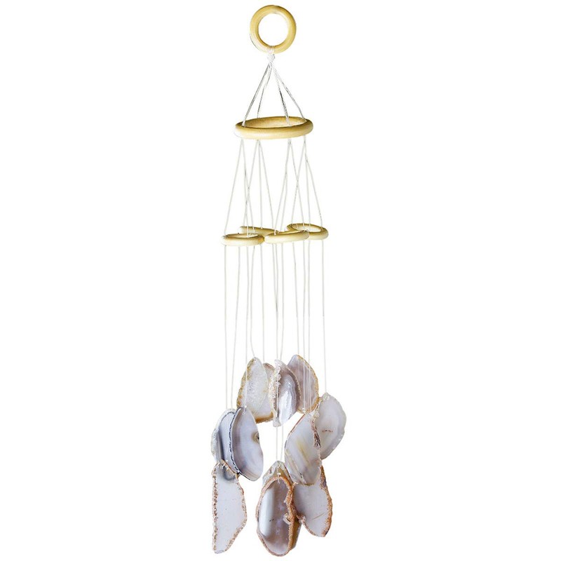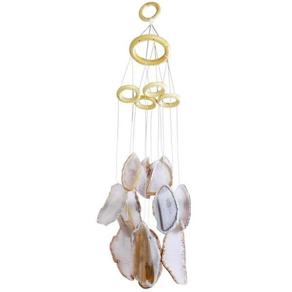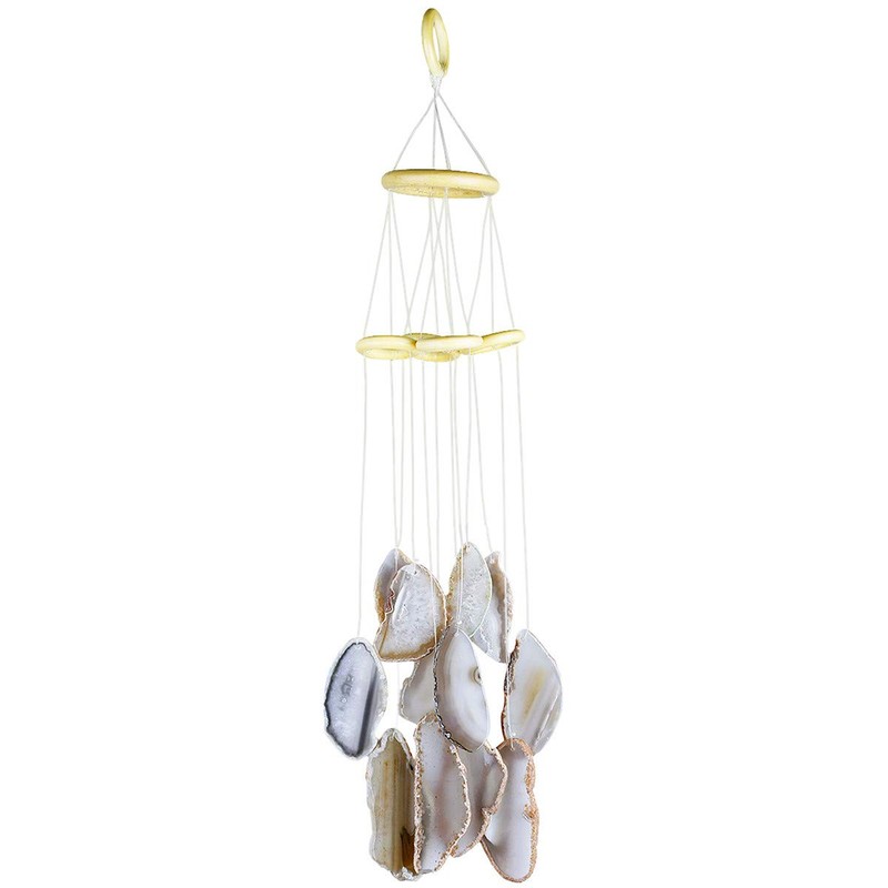 - Stylish wind chime for indoor and outdoor decor, 12 strands with mix agate geode slices. Overalll length: approx 20-23 inches, Dangle agate slices are 2.4-5.5 inches in diameter. Hanging ring size is 1 inches in diameter; Weights about 270-470 gram for each wind chime. Each agate slice is an original slight variations in color and shape are the nature of handcrafted craft.