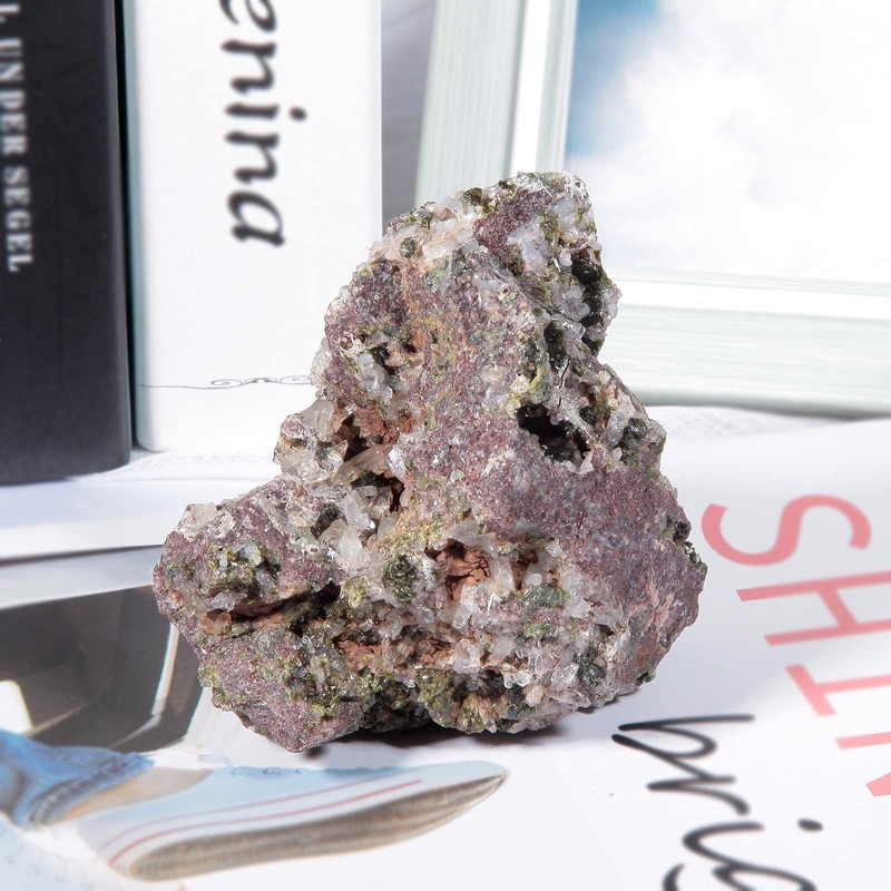 mookaitedecor Natural Epidote with Druzy Crystal Quartz Cluster, Mineral Raw Stone Specimen Ornament for Reiki Healing Home Decor, 400-500g