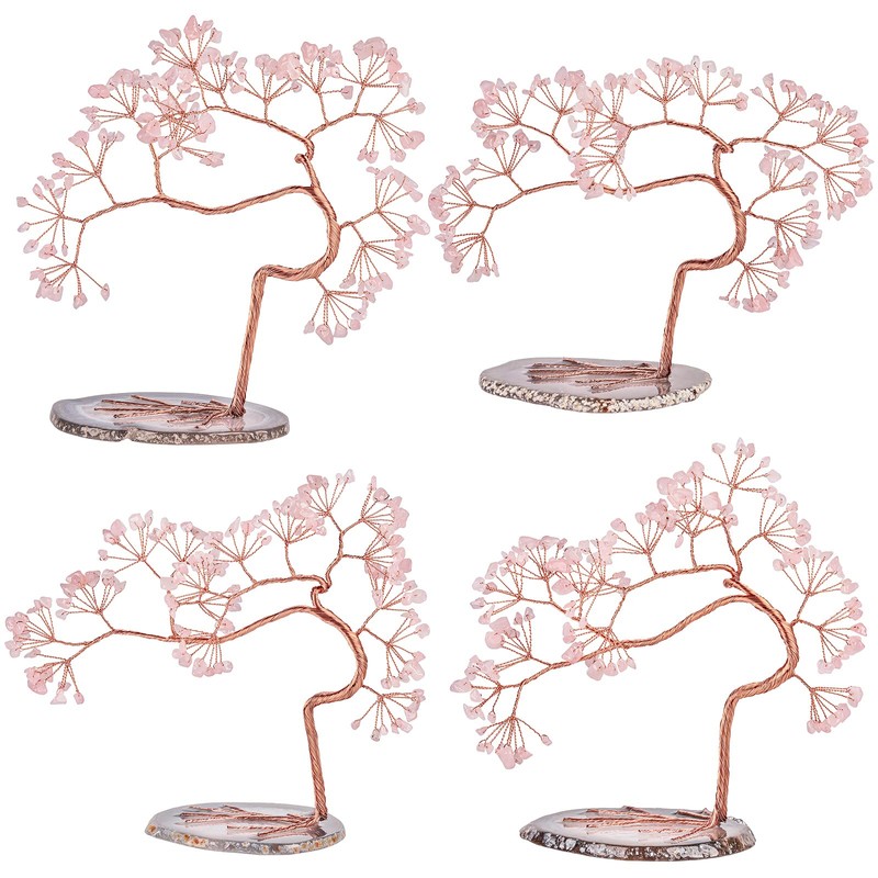 mookaitedecor Natural Rose Quartz Crystal Tree with Agate Slice Base, Feng Shui Money Tree Bonsai Sculpture for Home Office Altar Table Decoration 7-8 Inch