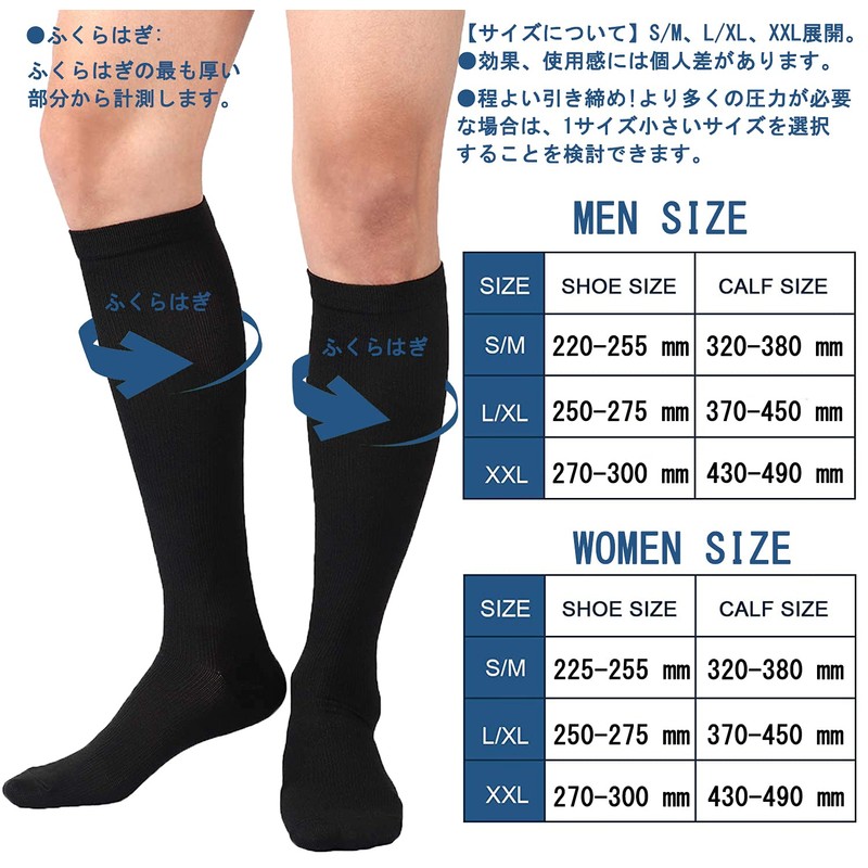 - ✔️[サポート力抜群]:中程度の厚さ、適度な圧力。3サイズからお選びいただけます。ご購入前に、ふくらはぎのサイズを測って商品をお選びください。■(圧を上げたいならサイズは小さすぎでもワンサイズ下げるなど。どこまで覆うかを重要視する場合はサイズ重視のほうが良いかとは思いますが。)①22.5~25.5cm(S/M) 足サイズ:22.5~25.5cm、 ふくらはぎサイズ:32~38cm 、全長(平置き):35cm ②25.5~27.5cm(L/XL )足サイズ:25.5~27.5cm 、ふくらはぎサイズ:37~45cm 、 全長(平置き):37cm ③27~30cm(XXL) 足サイズ:27.5~30cm 、ふくらはぎサイズ:43~49cm 、全長(平置き):39cm。