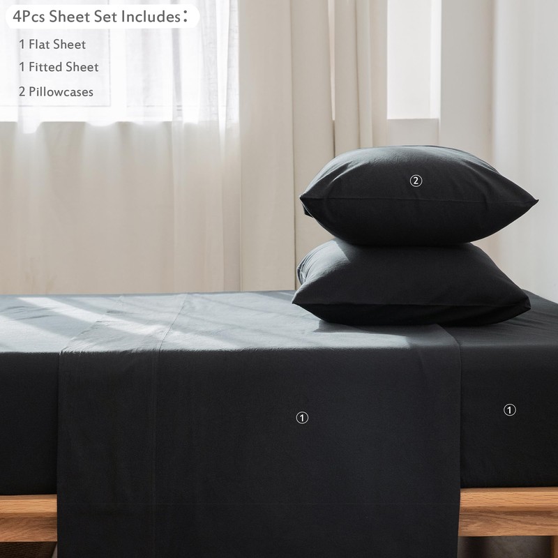 MooMee Bedding Sheet Set 100% Washed Cotton Linen Like Textured Breathable Durable Soft Comfy (Black, King)