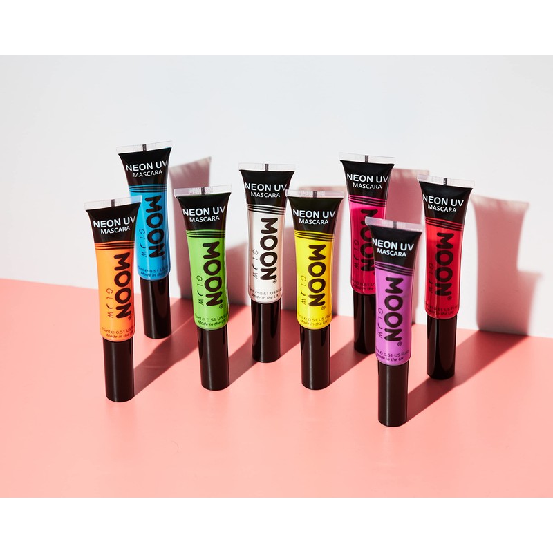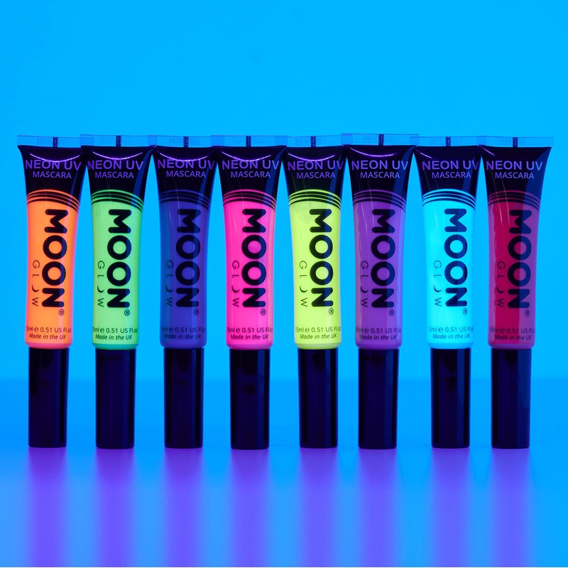 - MOON GLOW INTENSE NEON UV MASCARA - Eye-poppingly bright neon mascara with the added fun of fluorescent magic. All 8 super intense colours shine neon bright by day and give your lashes a stunning glow under UV lighting and blacklights - awesome!