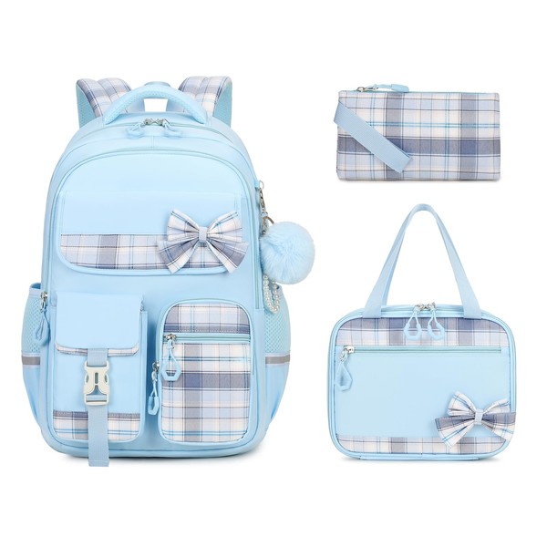MOONBABY Girls Backpack, Kawaii Kids Backpack for Girls School Bags for Middle School Students, Book Bag for Elementary Primary High School with Lunch Bag Pencil Case Set 3PCS, Blue