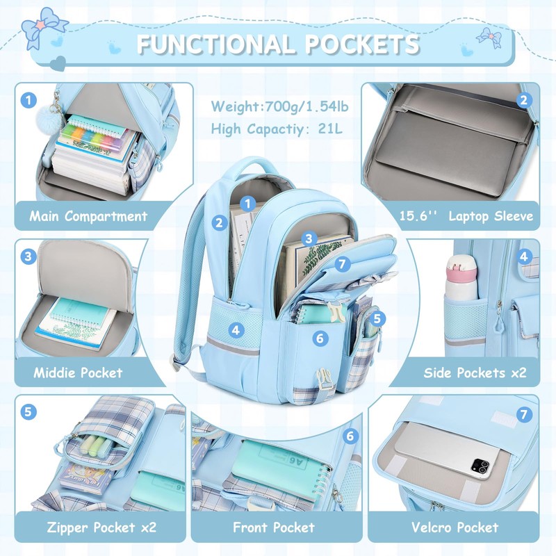 - 【STORAGE SPACE】With the size of 12.2*5.9*17.7", this backpack is convenient enough to help you easily organize all of your items. The main compartment of the girls backpack fits a 15.6-inch laptop, while the three exterior zipper pockets and one big pockets provide additional storage space, it also features water-bottle pockets on both sides, helping you easily access their laptop, books, and other essentials wherever they go