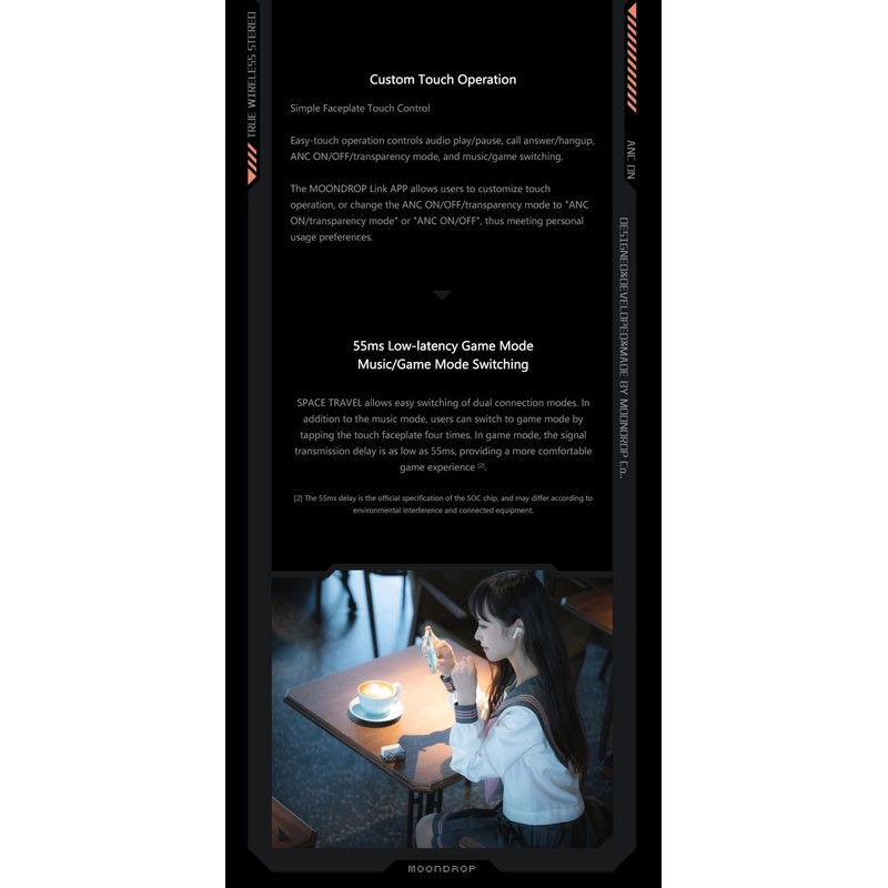 - 55ms Low-latency Game Mode,Music/Game Mode Switching: SPACE TRAVEL allows easy switching of dual connection modes. In addition to the music mode, users can switch to game mode by tapping the touch faceplate four times. In game mode, the signal transmission delay is as low as 55ms, providing a more comfortable game experience 2. [2] The 55ms delay is the official specification of the SOC chip, and may differ according to environmental interference and connected equipment.