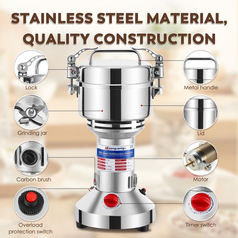 - Stainless Steel Body & Copper Motor - The whole body of grinder is made of High Quality Stainless Steel and meets food safety requirements. With the powerful 2500W Copper Motor and the 3-layer Stainless Steel Blades, various dry materials can be quickly smashed in 30 seconds - 3 minutes.