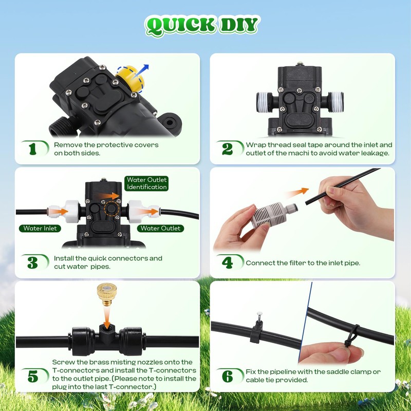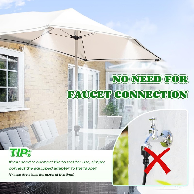 - Effortless DIY Misting System Our garden cooling system has everything you need to enjoy a cooler summer outdoors. The pump kit includes a misting pump, 20m of water pipe, 24 brass nozzles, 100 cable ties, 100 saddle clamps, thread seal tape, and more. Additionally, we offer a 3/4’’ US standard faucet adapter for a simple connection to your faucet. (Please note that the pump and faucet adapter cannot be used simultaneously!)