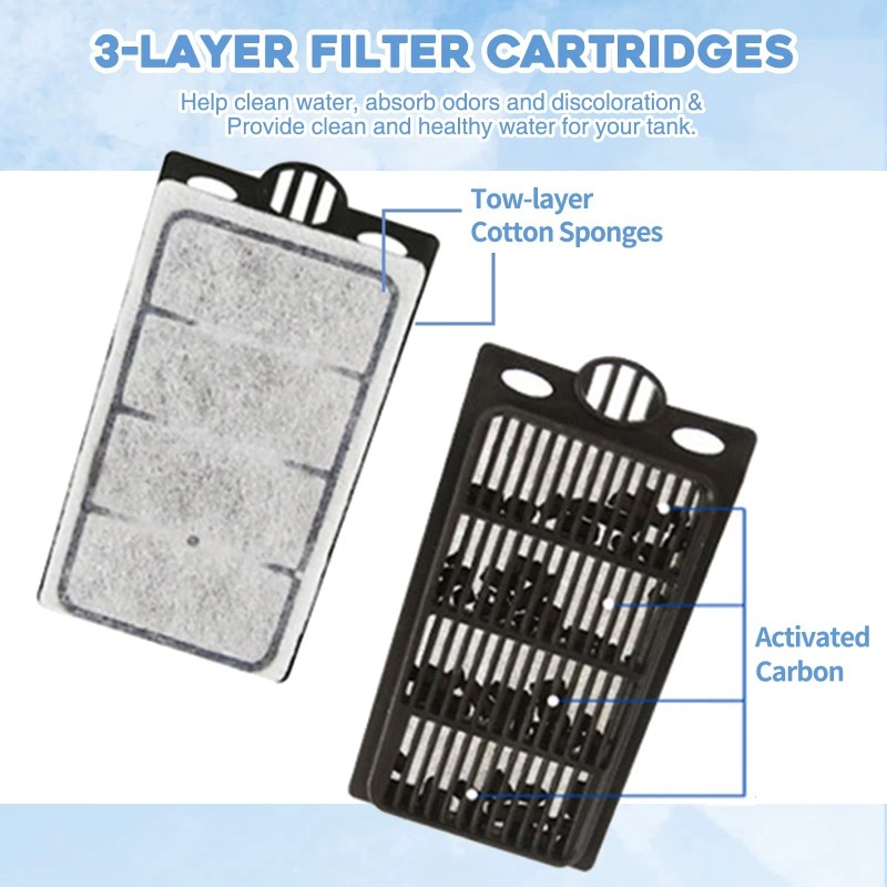 [3-LAYER FILTER CARTRIDGES] Help clean water, absorb odors and discoloration & Provide clean and healthy water for your tank. Package includes 2 filter cartridges for replacement. We suggest to change the cartridges every 1-2 weeks. You can also rinse the cartridge to prolong the serivce time.