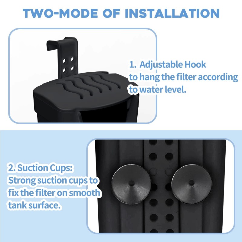 [TWO-INSTALLATION MODES] 1. Adjustable Hook to hang the filter according to water level. 2. Suction Cups: Strong suction cups to fix the filter on smooth tank surface. Any questions, please feel free to contact us, we will provide the best service to you.