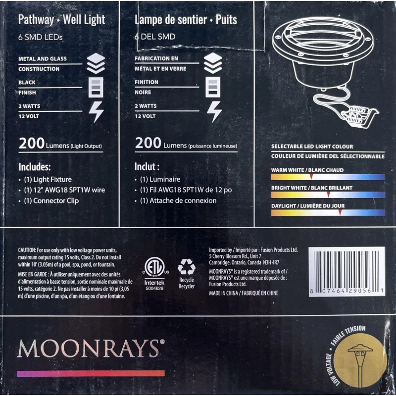 Moonrays 29056 Black Metal Well Light, Low Voltage Pathway Or Gardenscape Well Light, 6 SMD LED's, Uses Only 2 Watts, Produces 200 Lumens Light Output, Contemporary Design, Durable Metal And Glass Construction, Selectable Color Temperature To Match Your Lighting Preferences, 3000K (Soft White), 4000K (Bright White), Or 5000K (Daylight). Measures 6" Diameter, 3.6 Inches Total Height, Above Ground Height Of 1".