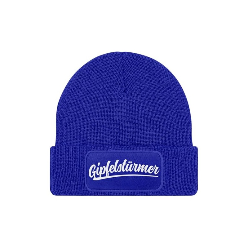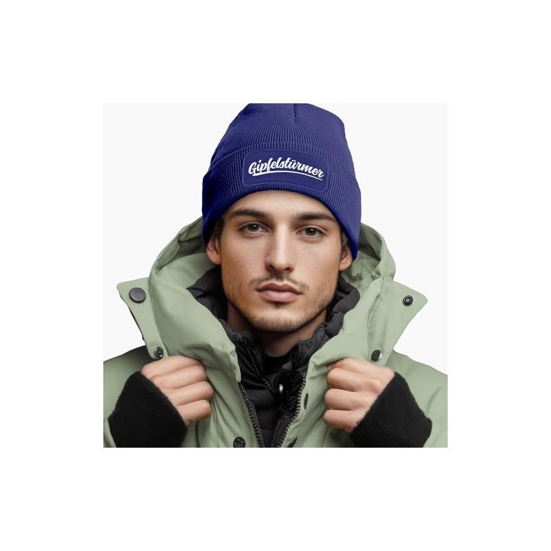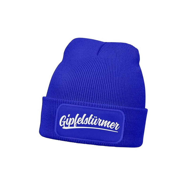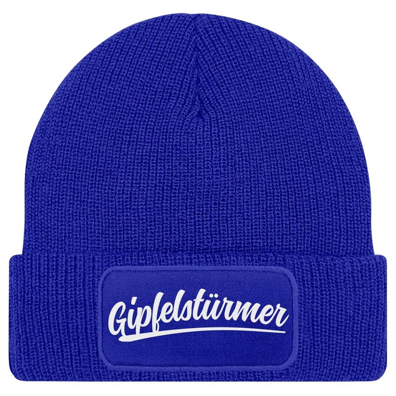 MoonWorks® Herren Beanie mit Patch Strickmütze mit Spruch Wandern Skifahren Aufdruck Gipfelstürmer Mütze Männer Blau Unisize
