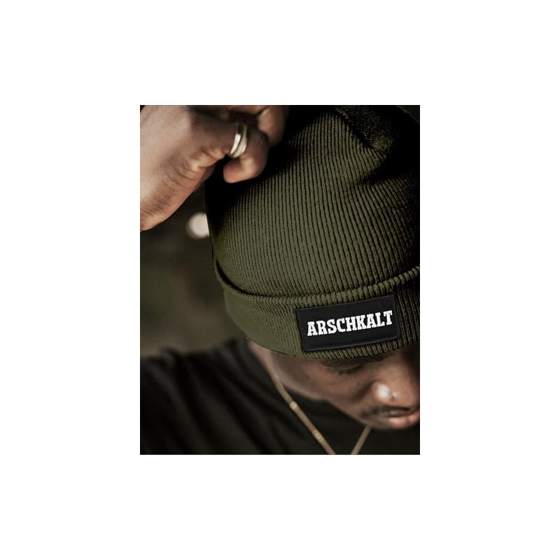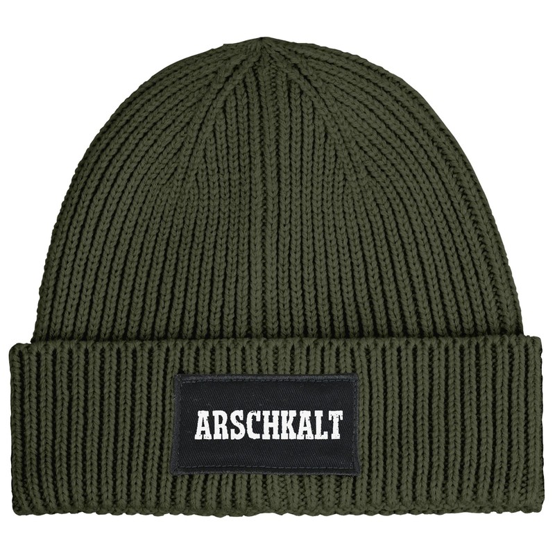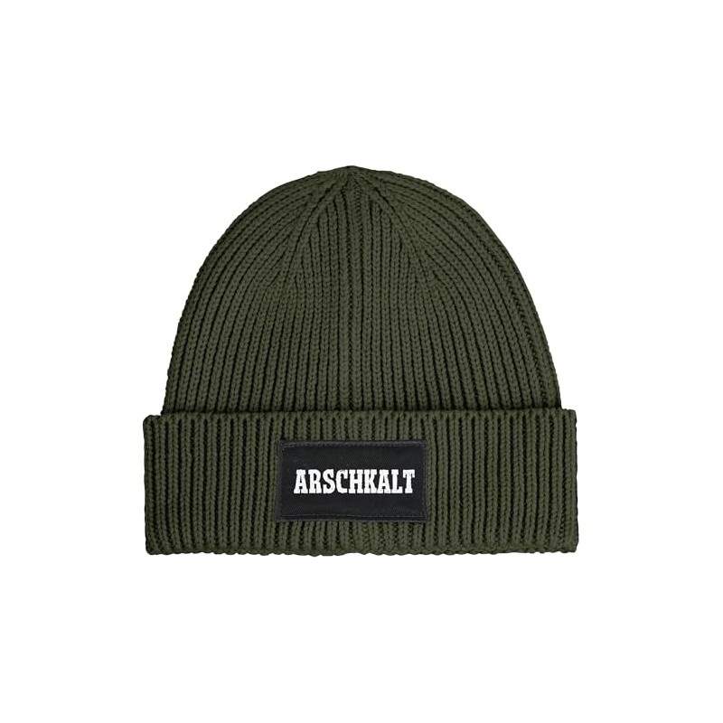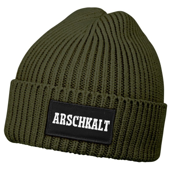 MoonWorks® Men's Beanie with Patch Knitted Hat with Saying "Arschkalt Print" Funny Hat Men, olive