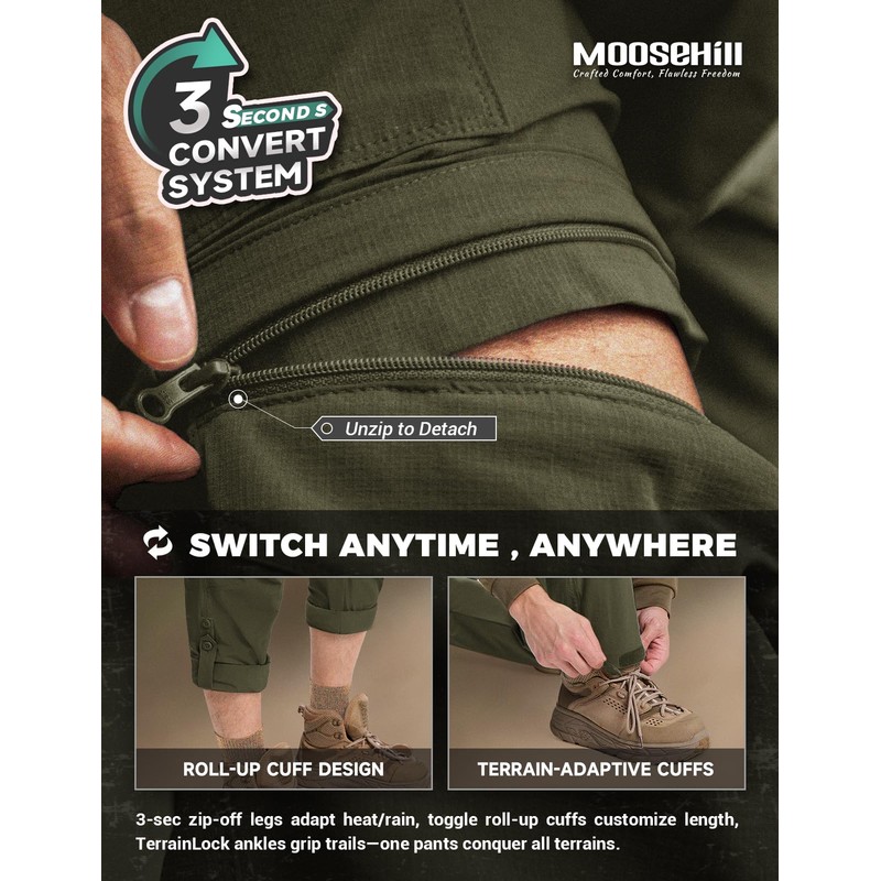 Moosehill Men's-Hiking-Pants Convertible Quick-Dry Water-Resistant Lightweight Zip-Off Outdoor for Hunting, Fishing, Safari with 5 Deep Pockets (Army Green, 34W*32L)
