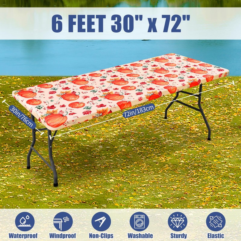 Moosfor Spandex 6 Foot Rectangle Thanksgiving Table Cloth 2 Pack, Elastic Fitted Tablecloths for Picnic, Stretch Washable Patio Table Cover for Autumn Harvest Parties (Pumpkin Leaf, 30"x72")